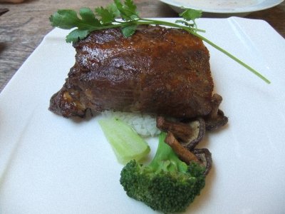 我們三人點了豬助排飯、松阪豬、紅咖哩墨魚麵。還有自助式沙拉吧和餐點,再加上環境和氣氛上很幽美,這頓飯雖然貴了點也很值得,它的外觀就像一座紅色小城堡,餐點和環境請看以下的相片(拍的不好就是了)