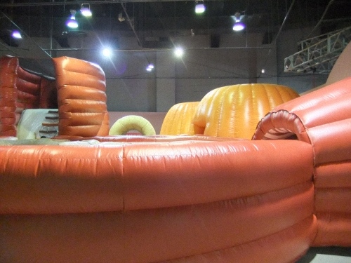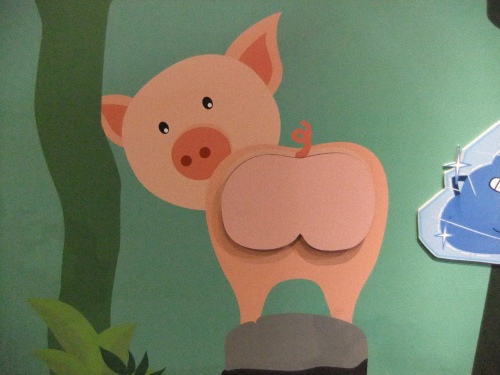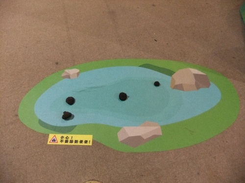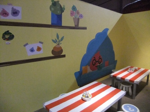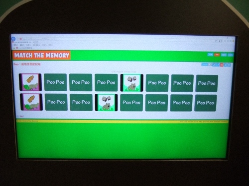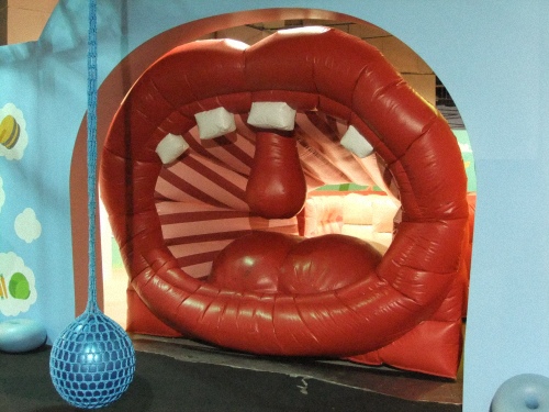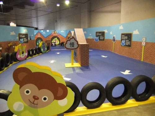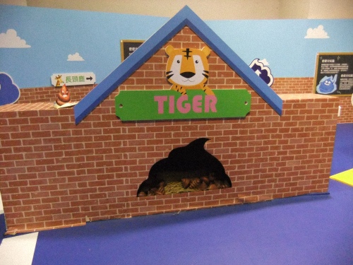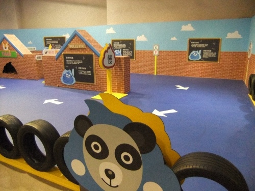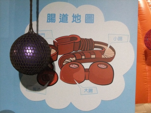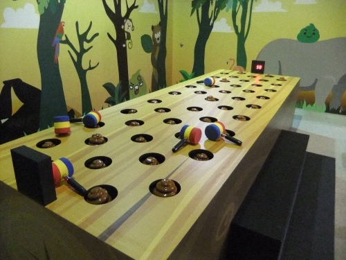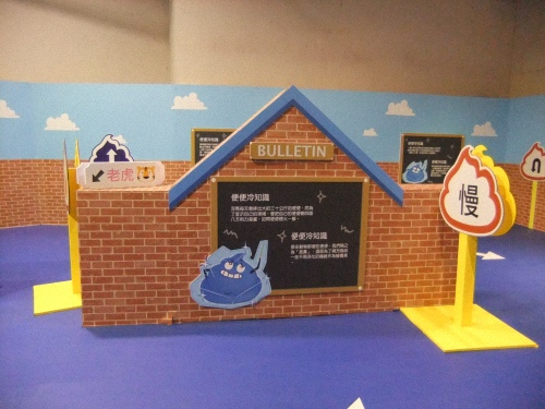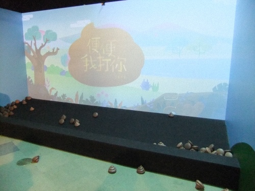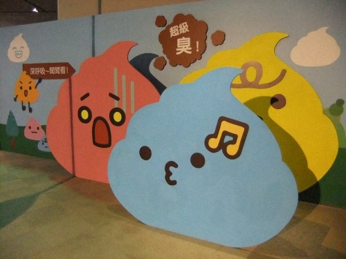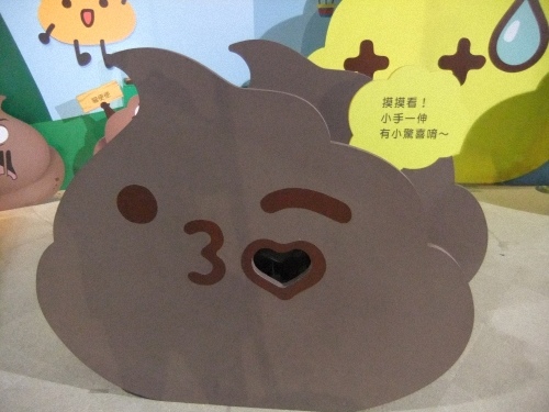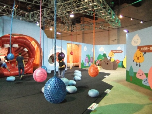 裡面有腸道大冒險、就是做成腸道形狀的溜滑梯過關遊戲,這個小孩子會喜歡。旁邊還有便便鞦韆繩,可以讓你盪鞦韆。旁邊還有 便便我打你的互動電子遊戲,拿起下面的便便球吧,丟向畫面的便便解救那些被便便攻擊的動物。往後走還會有打地鼠..呃,是打便便的遊戲。還有便便競賽車的遊戲區。