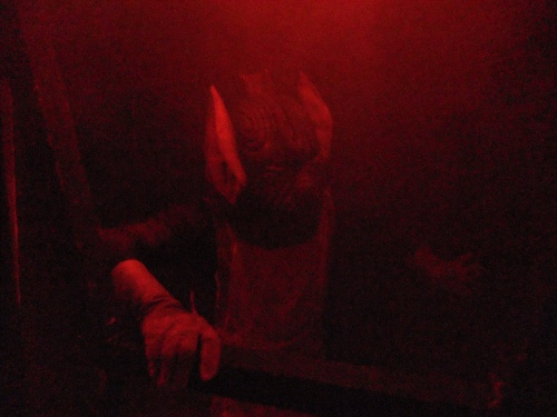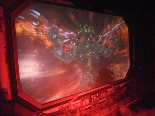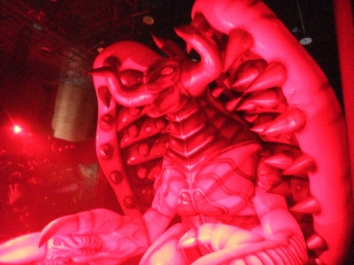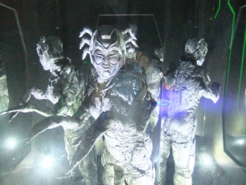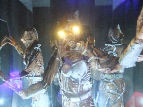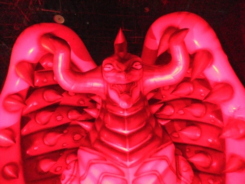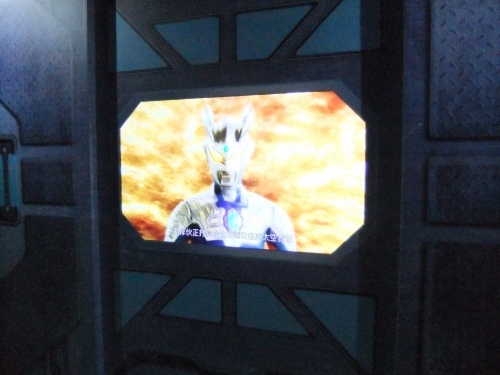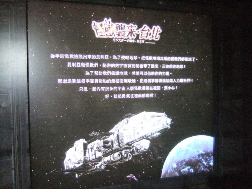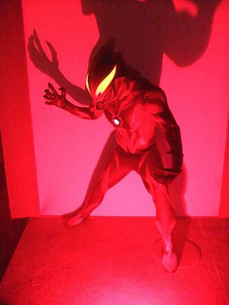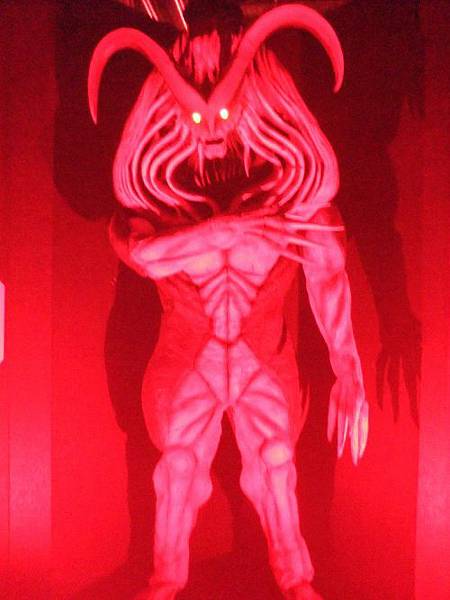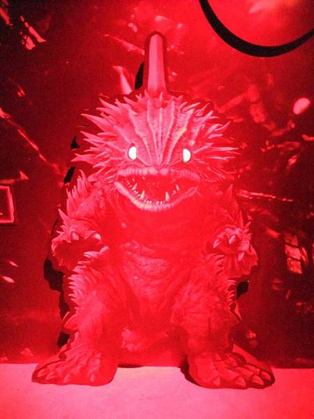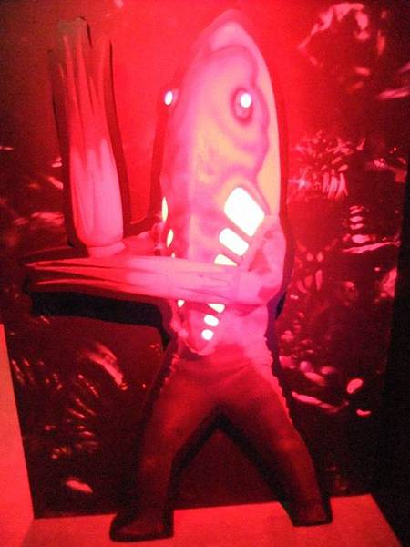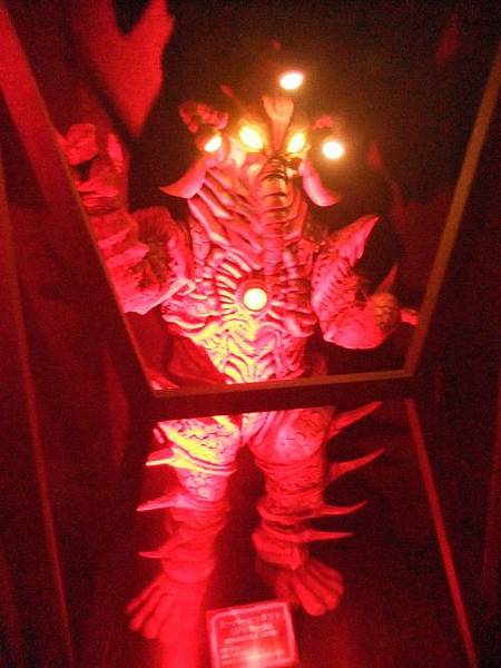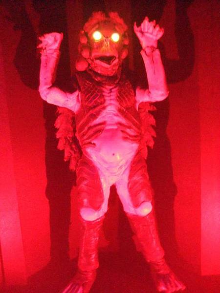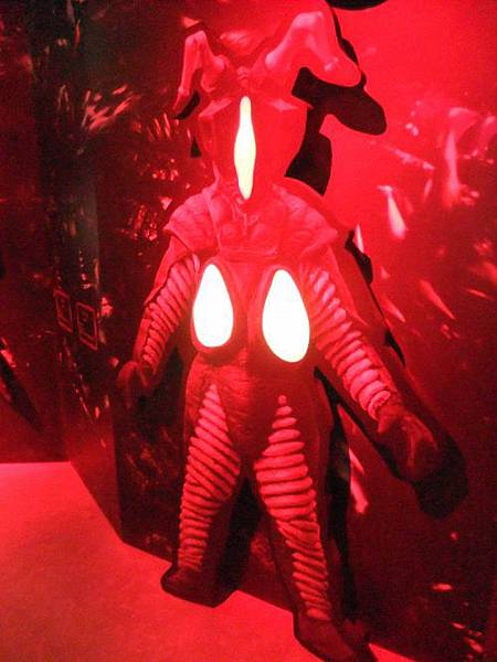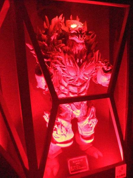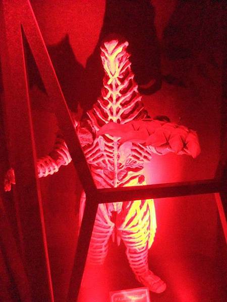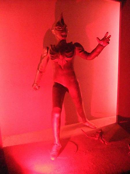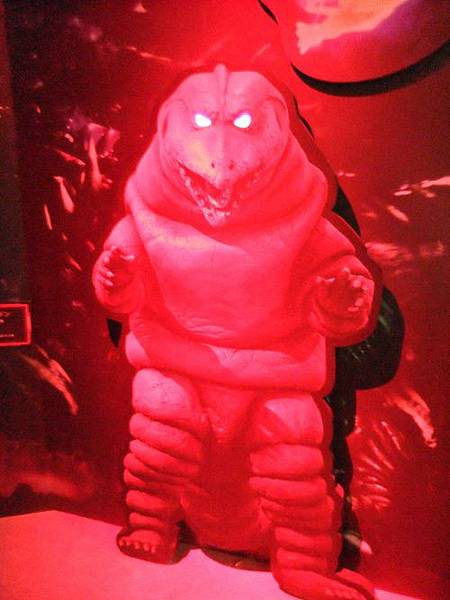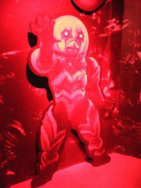 接著就是進來看啦,這個跟我去九族文化村看的「奧特曼英雄超決戰in九族文化村」不一樣,怪獸襲來就是類似怪獸的鬼屋,進去後就是很詭異的氣氛和燈光,腳站上定點後,就會出現怪人在你面前,中途會有些怪獸的人形看板在那邊,大多是昭和時期的怪獸,有看過早期超人力霸王的一定有印象,還會有工作人員假份的怪人會嚇嚇你,但那邊的乾冰效果太強,工作人員扮的怪人冒出來時我還沒發現怪人出來了,所以也沒拍照好XD,真是太可惜了,我是怪獸派的,本來想衝上前抱住他的。