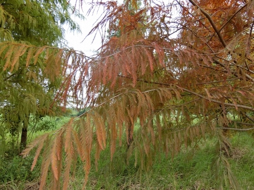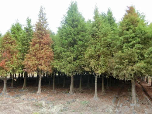 看完微酵館後,我繼續往北行,到了六甲時,旁邊有很多的落羽松,這裡可以放慢點速度來看一下,再稍往前面一點,可以到達「菁埔埤」這地點,這裡也有很多的落羽松可以看,前次去新社莊園時,那邊的落羽松很多都變紅了,但這裡的只有少數幾株變紅,可能跟地理和天氣有關吧,挑對時機來的話,應該會是紅通通的一片很漂亮,今天來的時候可能不對,就下面的相片請參考一下吧。