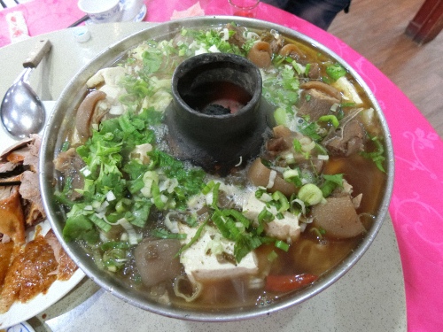 走完後,我們再坐接駁巴士(1人20元),我旁邊坐了一個漂亮的小妹妹,運氣真不錯,坐巴士回到吊橋另一端後,我們騎著噗噗原本想去霧台看櫻花的,但聽說那裡大塞車,我們決定到屏東縣吃中餐,我們在屏東縣自由路752號的國民餐廳用餐,因為我們只有三個人,我們只點了 羊肉爐 和 烤鴨 來吃,很美味的一餐。
