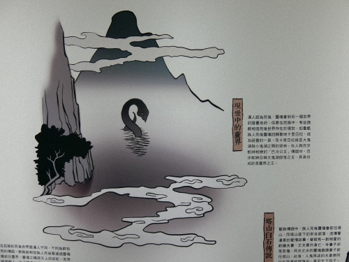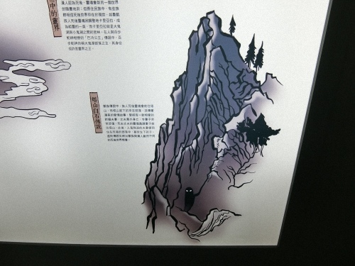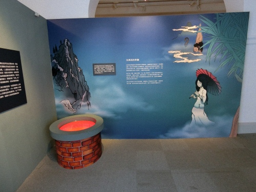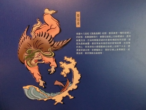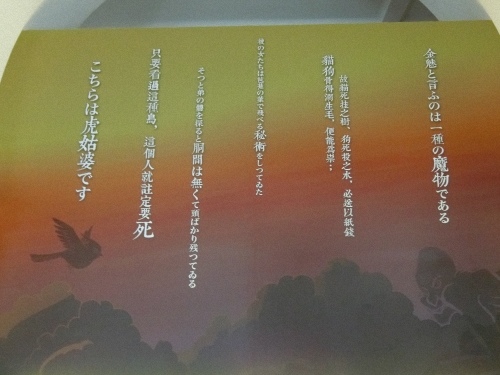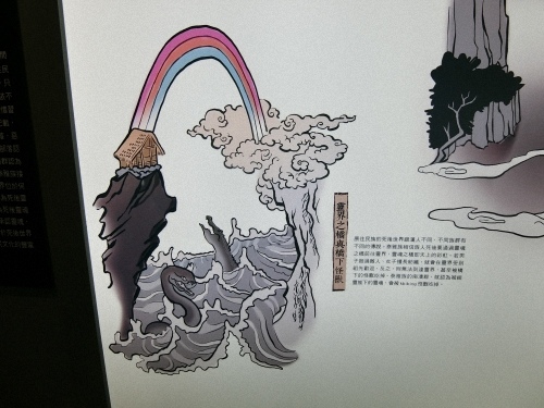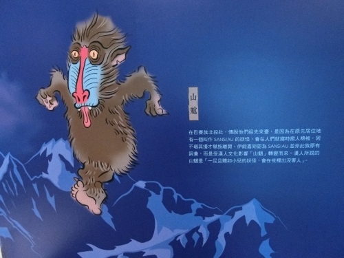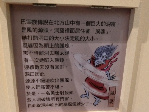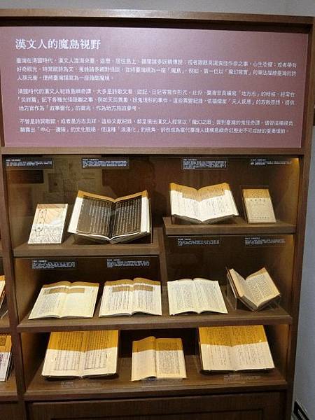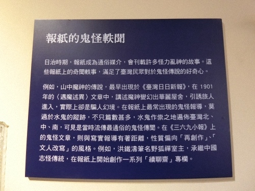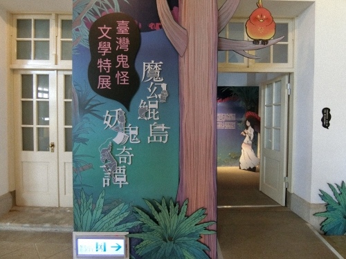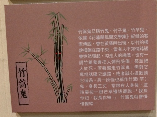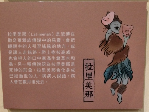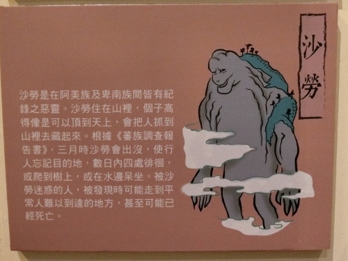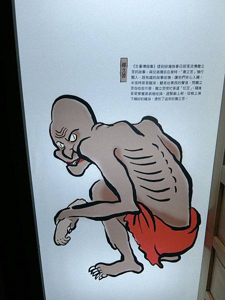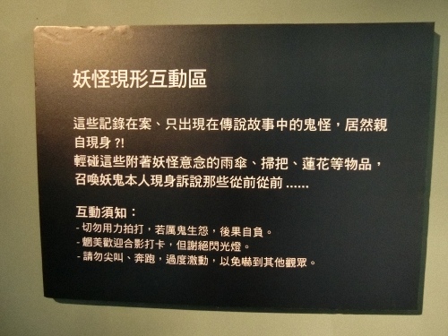 走進去後,我想跟旁邊的林投姐人牌拍照,熱心的工作人員還幫我喬站牌喬好久,我都有點不好意思了~,也很感謝他就是了。接著就開始進去走走逛逛啦,喔喔,原來台灣之前的雅稱叫做「鯤島」呀,而且我們得知的一些傳說妖魔鬼怪的故事都是記錄在古老書冊當中,這些記錄都來自17世紀~20世紀的各種古文書,但大都是漢人、日本人、西方人等等不同文化背景的人所描述的,還有些是認為台灣這種偏遠的小島,不會有人來,所以就編造了一些鬼怪故事流傳至今,結果說故事的人似乎也自個沒來台灣~~,反而台灣的主人-「原住民」都沒留下所謂怪異的傳說故事。