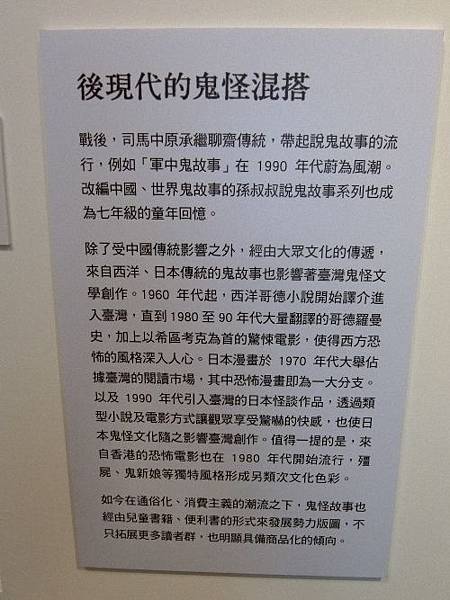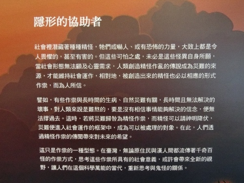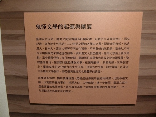 說真的,我沒來這個展之前,我也只知道台灣的鬼怪傳說有 虎姑婆、水鬼、地牛之類的,但來到這裡逛了後才發現原來台灣的鬼怪傳說也不少嘛,而且還有台灣鬼怪文學作品,也有看到台灣鬼怪的介紹圖鑑(裡面還有能力圖),還有影音互動區,也有以精神層面來解說鬼怪的傳說和生於社會結構的妖怪,也有講解原住民各族對於死後世界的認知是不同的。