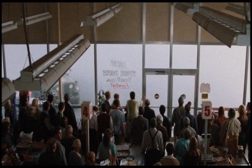 ※九頓飯理論,就是那個讓男主角戴綠帽的強勢女主角說的話「人類秩序與無政府狀態之間只有九頓飯」,我直接解讀的結果就是這個世界的人只要沒吃沒喝三天,這個世界就會崩壞了,這算是全片最有說服力的一句話,因為迷霧的關係,大家的糧食都快吃完了,開始出現恐慌的現象,這的確是很現實的問題。
