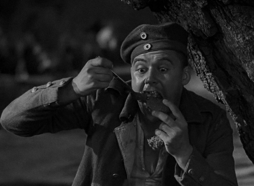 ↑在前線沒東西吃,到了後方吃到廚師煮的美食狼吞虎嚥的畫面,讓我也想跟著餓了…以前的演員演技真的是又硬又有感染力