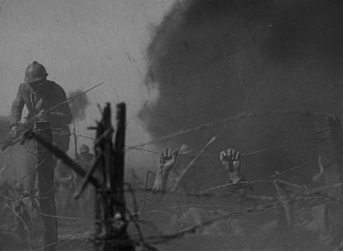 除了演員外,裡面戰爭的場景和爆破以當時的技術來說,我覺得已經很棒了,可以感受到二批人馬互戰的氣氛,而且最主要是壕溝戰和鐵絲網和短兵相接的畫面很具衝擊性(尤其是那雙吊在鐵絲網上的雙手),一部92年前的電影就道出戰爭的殘酷,好奇查了一下第一次世界大戰的時間,是從1914年到1918年,這部電影1930年上映,第一次世界大戰也才不過經過12年的時間,或許說,這部電影拍出了當年最接近戰爭的真實場面吧。