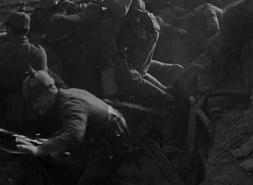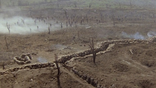 而當保羅為期十個星期的訓練後要上火車前往戰場時,下火車的人們則是一批又一批的傷兵,這個畫面剛好跟保羅這群新兵上戰場的畫面形成一個對比,這個也是1930年版看不到的,而且戰場畫面也拍的挺好的,法國方還比1930年版多了毒氣與火炎噴射器這二個武器,凱特也道出這群受過訓練的新兵因為戰鬥經驗不足,所以死傷率非常高,而且非常年輕,也教他們其實鏟子這武器比刺刀更好用,因為刺刀刺進敵人身體拔不出來,就會被敵人有機可趁,而鏟子只要往頸肩部份砍下去就很快,這就是實戰的眉角。